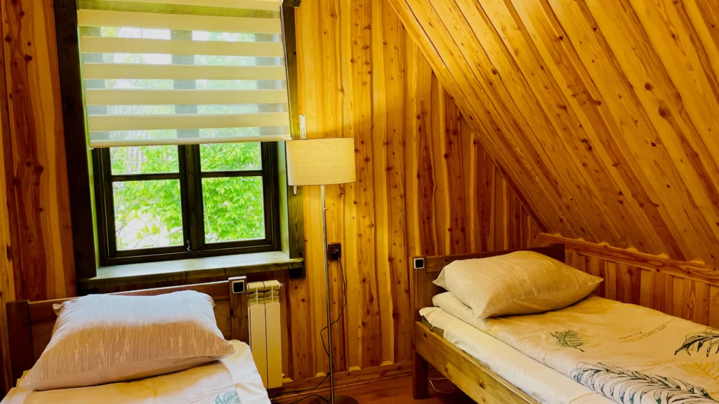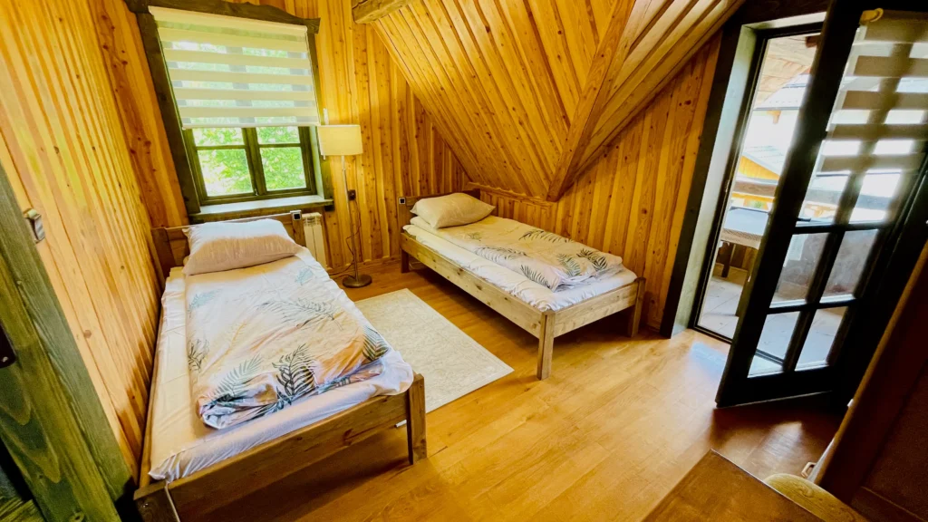 Przytulny pokój dwuosobowy na piętrze z wygodnymi pojedynczymi łóżkami to idealne miejsce na wypoczynek po aktywnym dniu na Roztoczu. Komfortowe materace zapewniają spokojny sen, a prywatna łazienka gwarantuje pełną wygodę i intymność. Ciesz się ciszą i spokojem w przyjaznej atmosferze, która sprzyja relaksowi i regeneracji sił. To idealny wybór zarówno dla przyjaciół, jak i osób podróżujących służbowo. W trosce o spokój i komfort wszystkich gości, pobyt ze zwierzętami w tym pokoju nie jest możliwy.